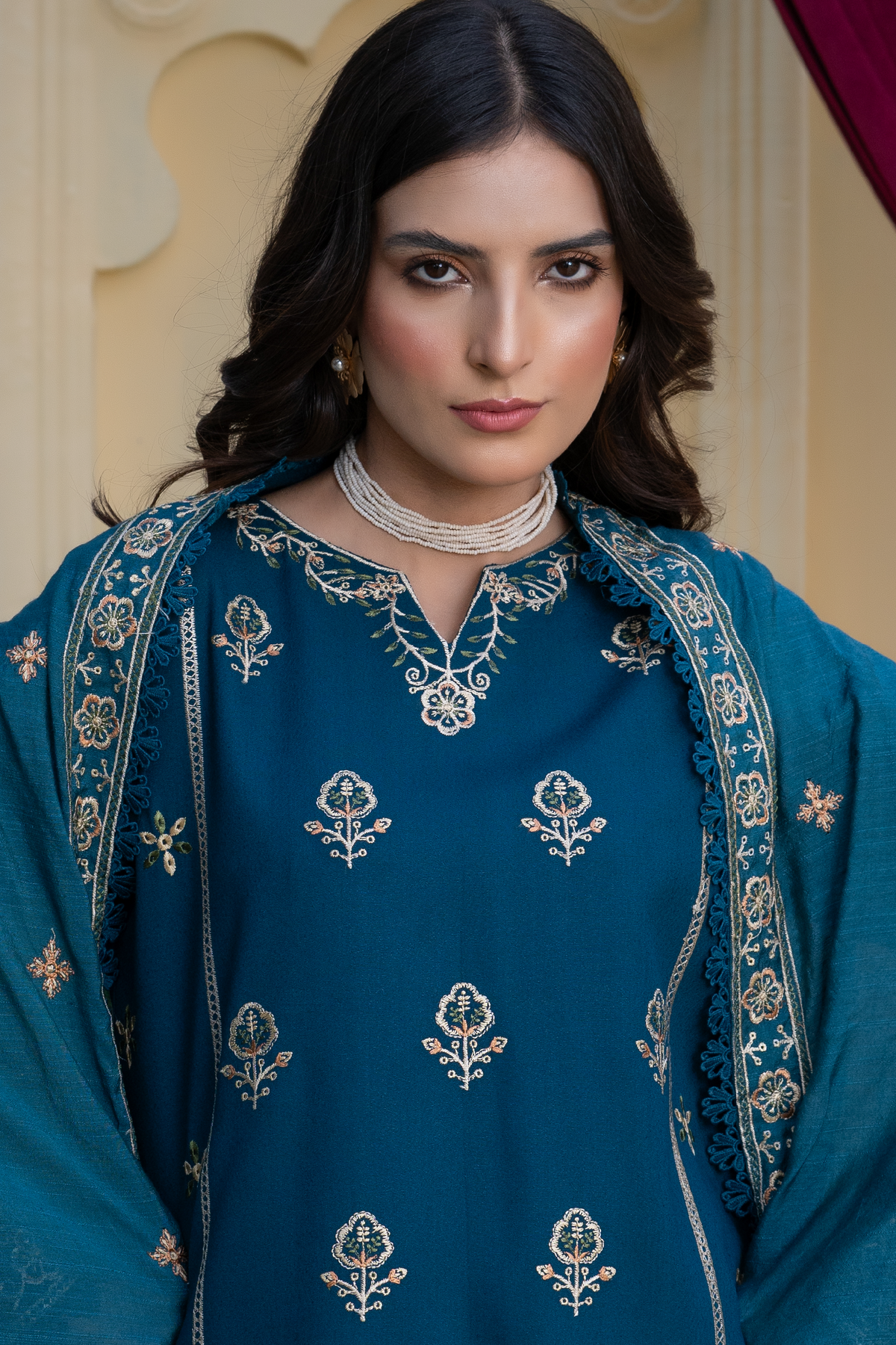 This timeless piece features an embroidered V-shaped neckline and delicate spray embroidery across the front, creating a gentle shimmer that catches every glance. The embroidered slits and intricately detailed sleeves enhance its refined charm, while lace finishing along the dupatta, hem, and borders adds a soft, feminine touch.