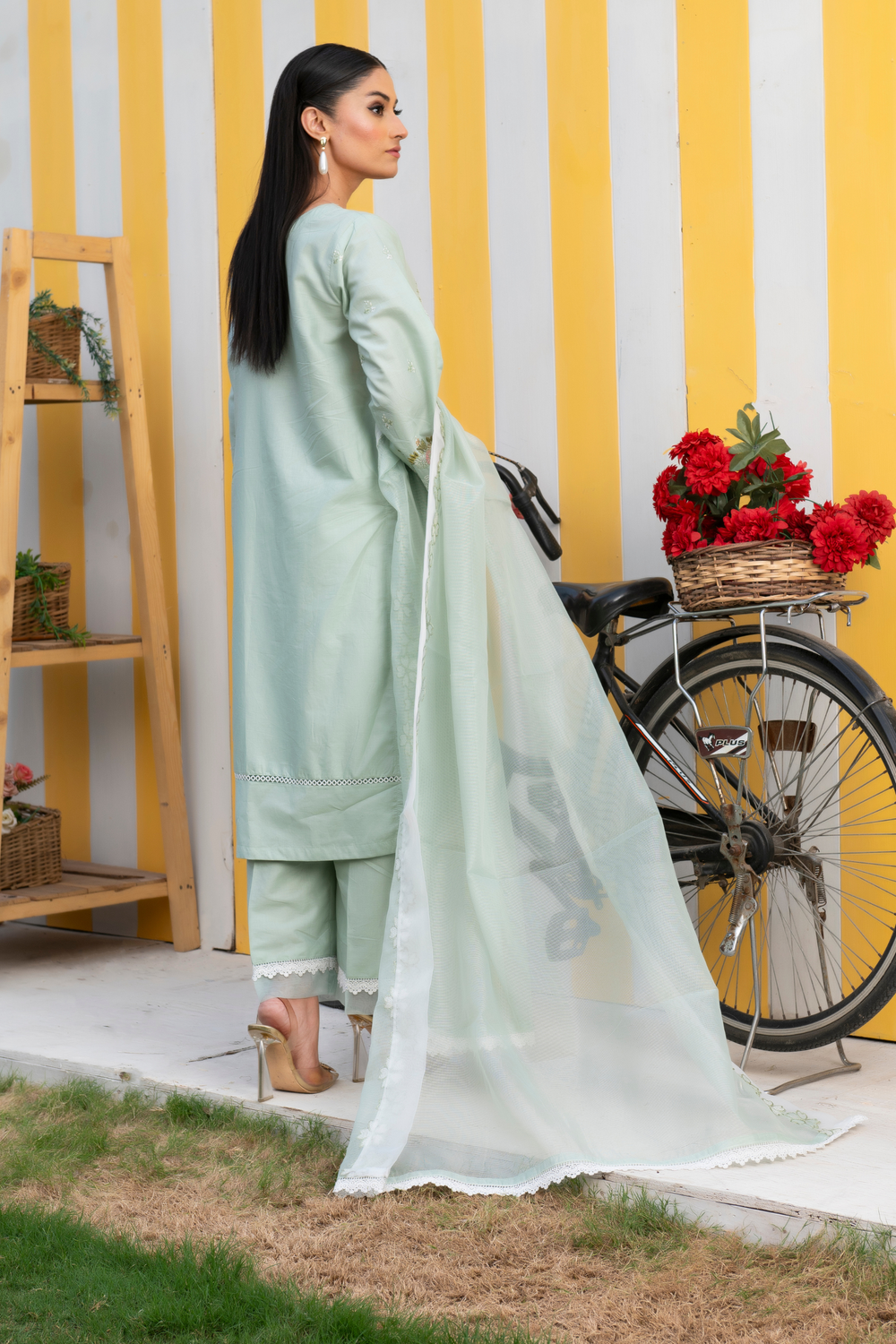 Eluna is a sophisticated summer festive dress crafted from breathable lawn fabric, featuring intricate embroidery on the shirt complemented by delicate adda embellishments. The ensemble is completed with a cotton net dupatta adorned with matching embroidery, offering both elegance and comfort ideal for warm-weather celebrations.