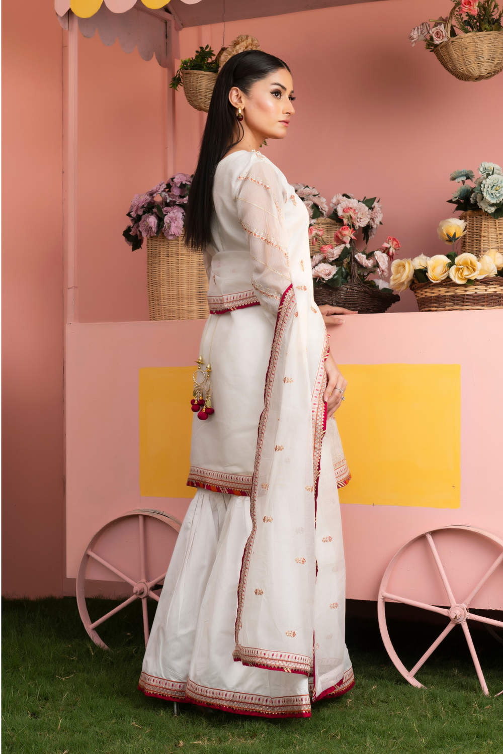 Solara is an elegant summer festive dress crafted from breathable cotton net in pristine white, designed specifically for nikah and engagement ceremonies. It features intricate embroidery combined with traditional adda embellishment techniques, offering a refined and sophisticated look perfect for special occasions. The lightweight fabric ensures comfort throughout the event while maintaining a graceful silhouette.