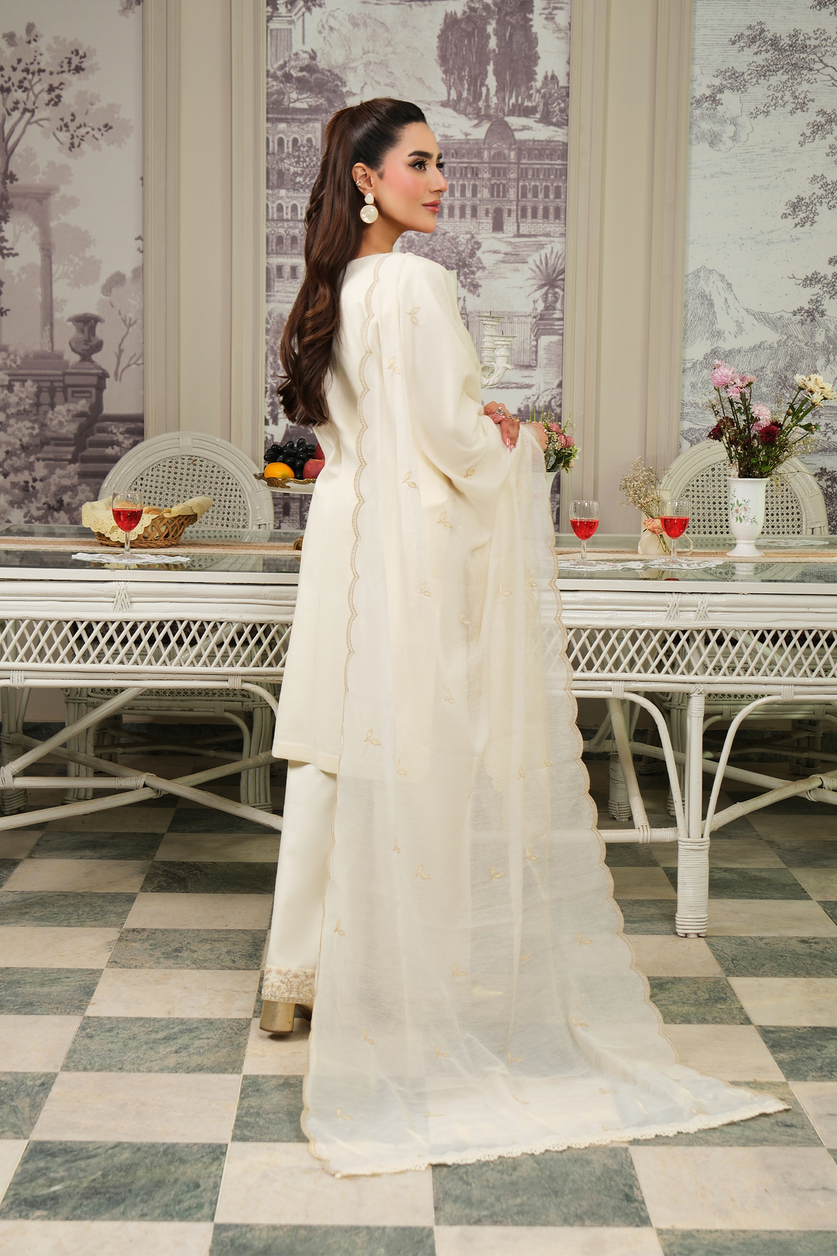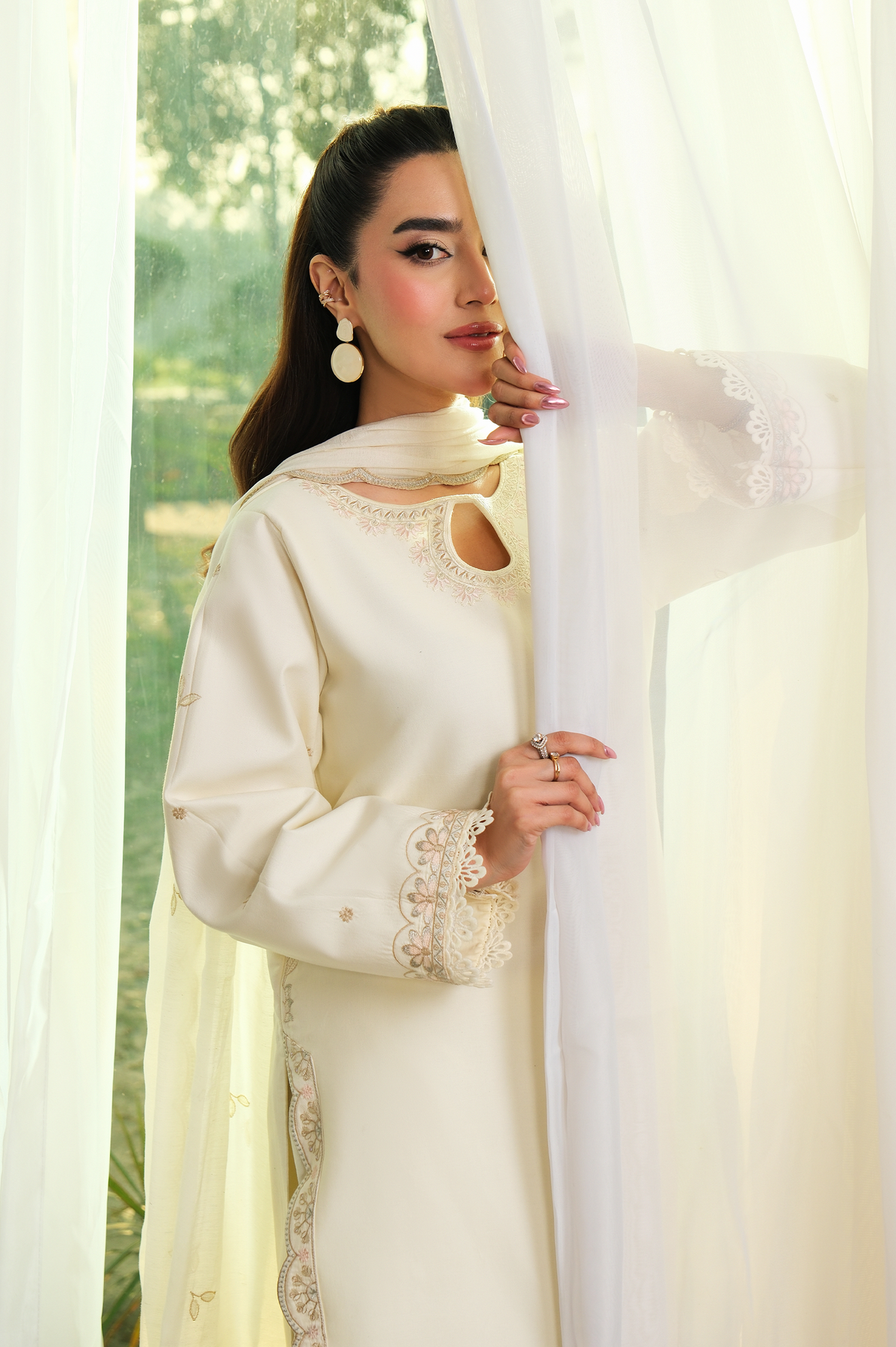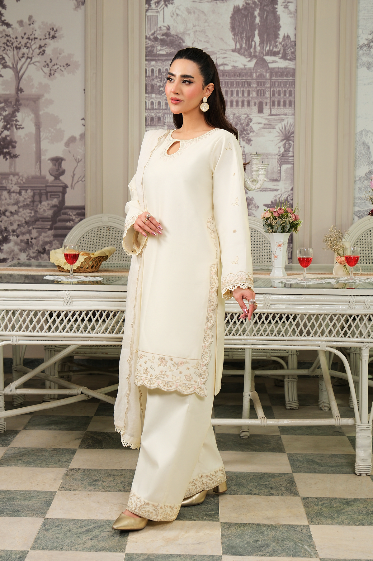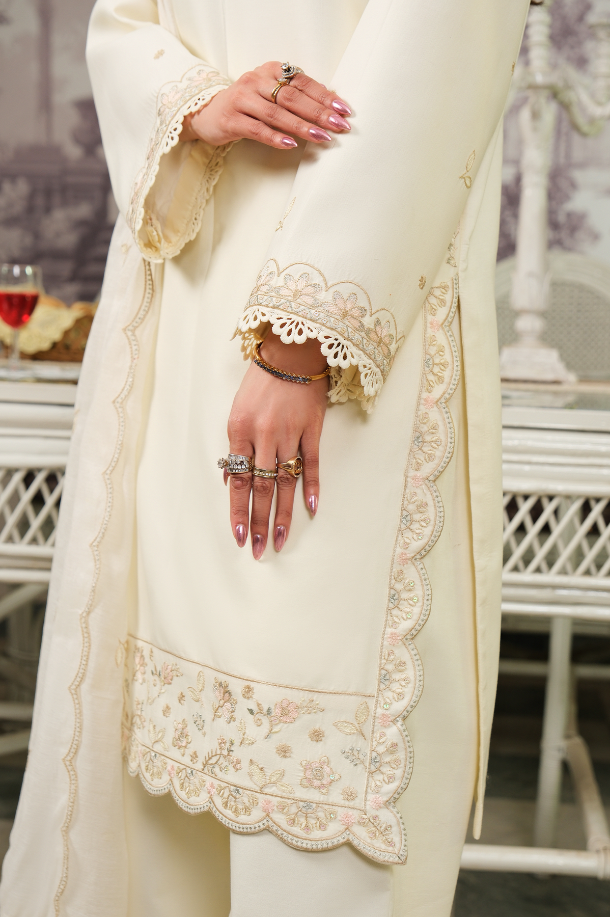 Presenting a graceful cream 3-piece ensemble designed with minimal elegance and refined detailing. The shirt features a softly styled neckline with a subtle keyhole detail, while scalloped cutwork embroidery along the sleeves and hem adds a delicate, handcrafted finish.