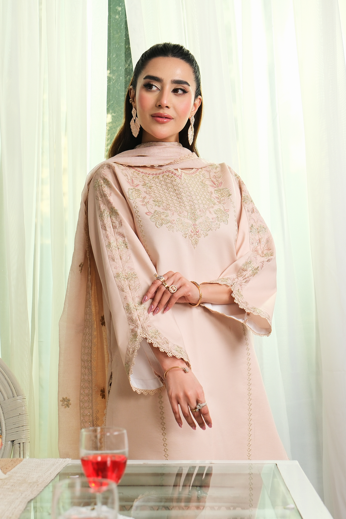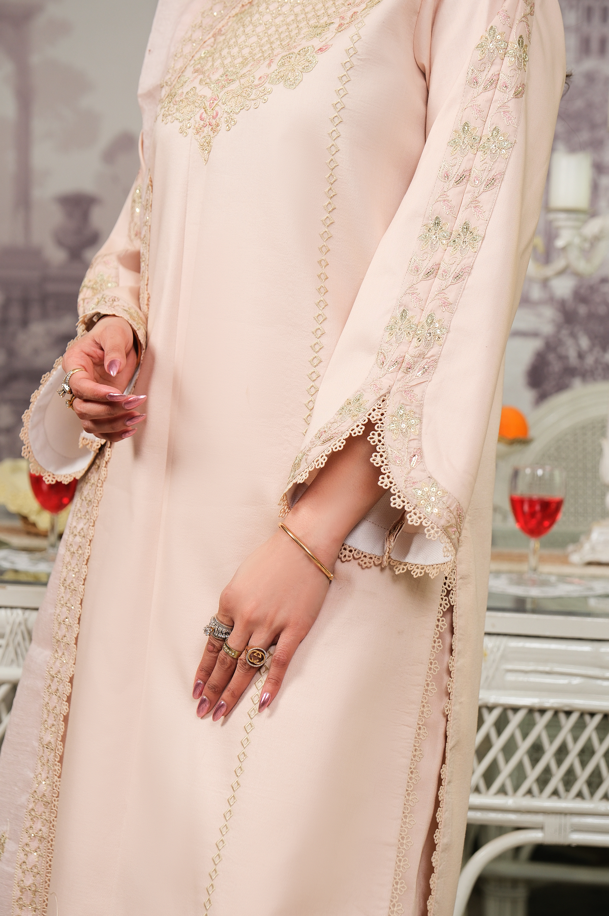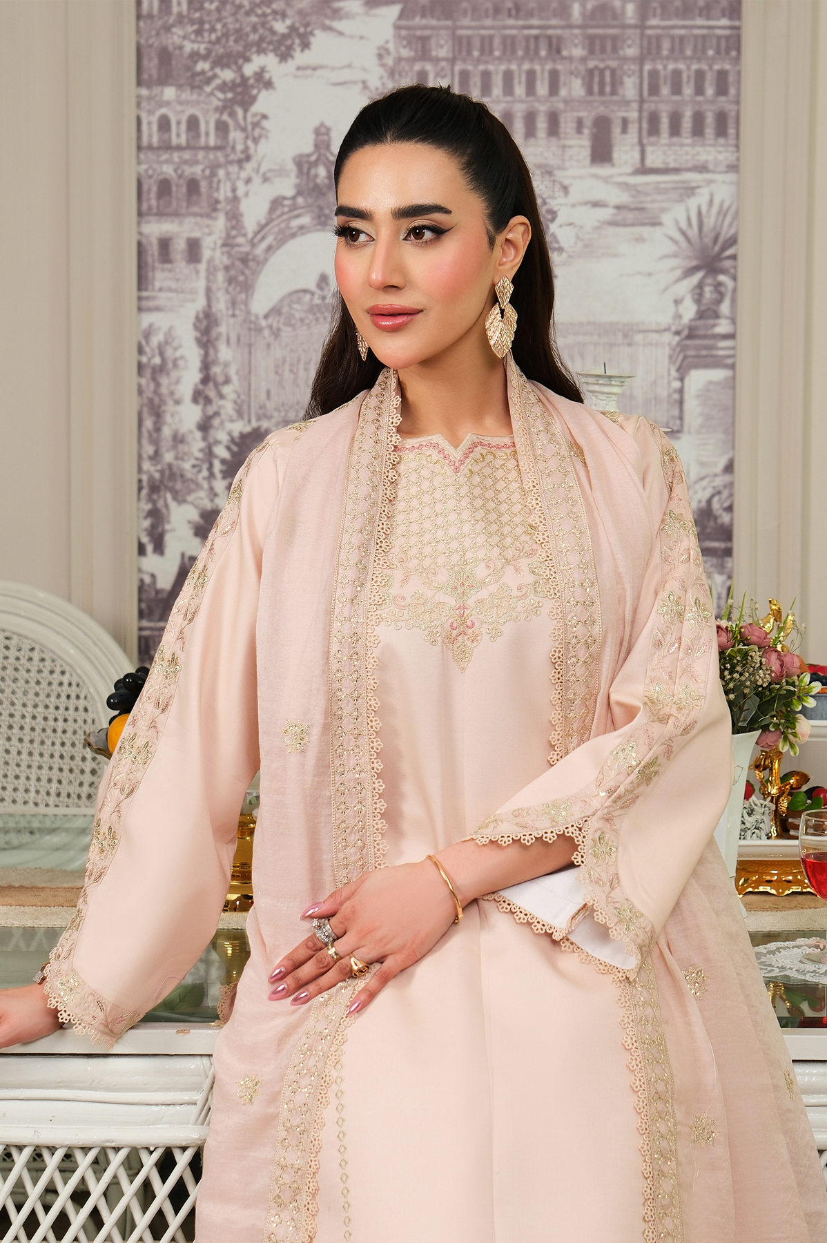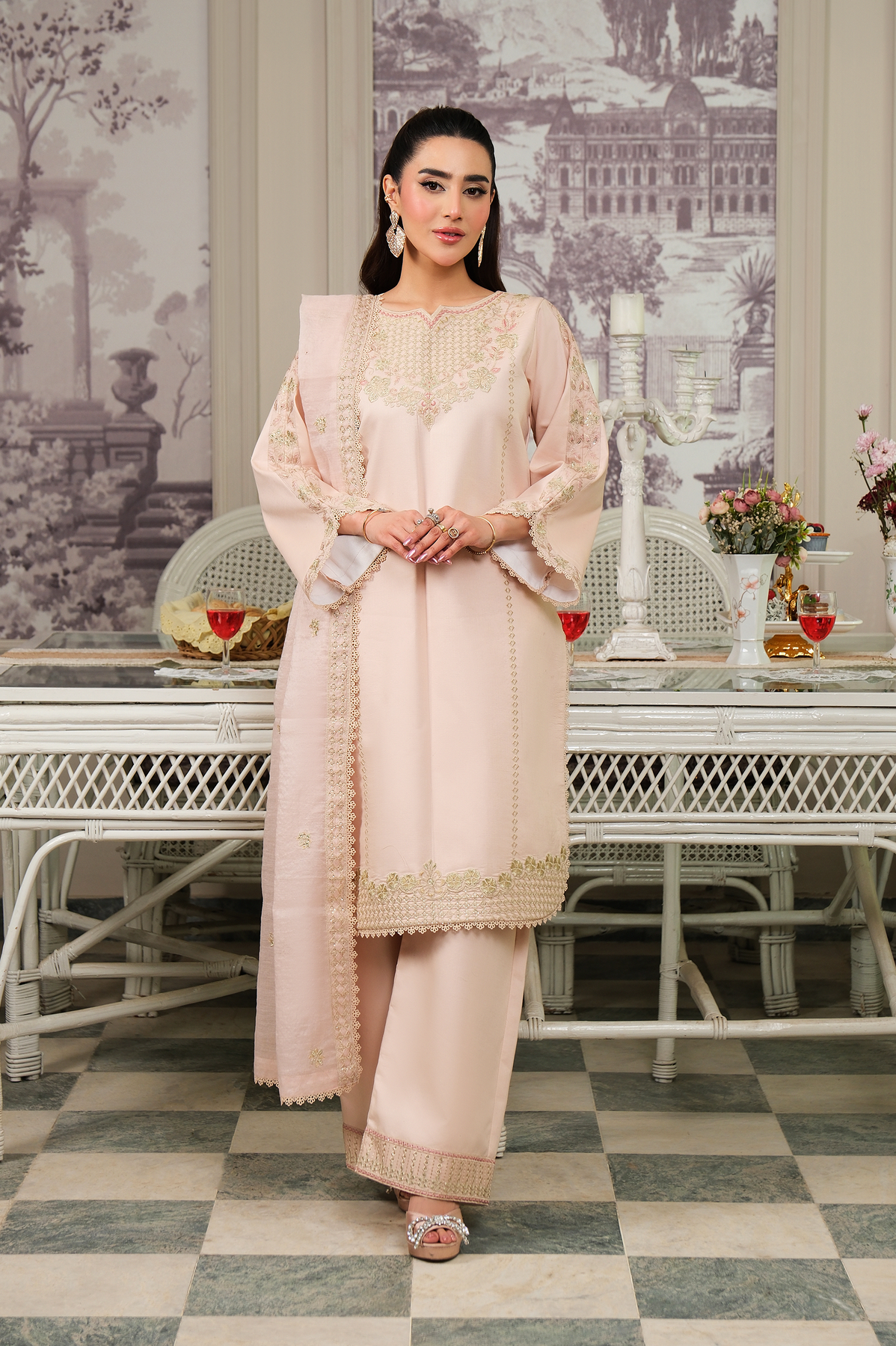 Introducing a soft peach 3-piece ready-to-wear ensemble, designed with feminine elegance and refined detailing. The straight-cut shirt features intricate embroidery along the neckline and front, enhanced with delicate sequin accents for a subtle touch of shimmer. Embroidered sleeves and hem add depth while maintaining a balanced, polished look.