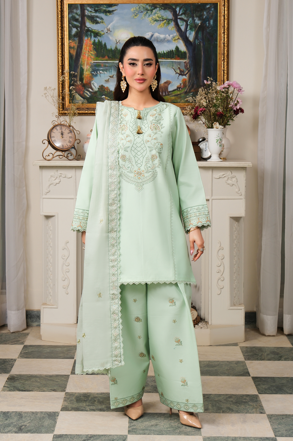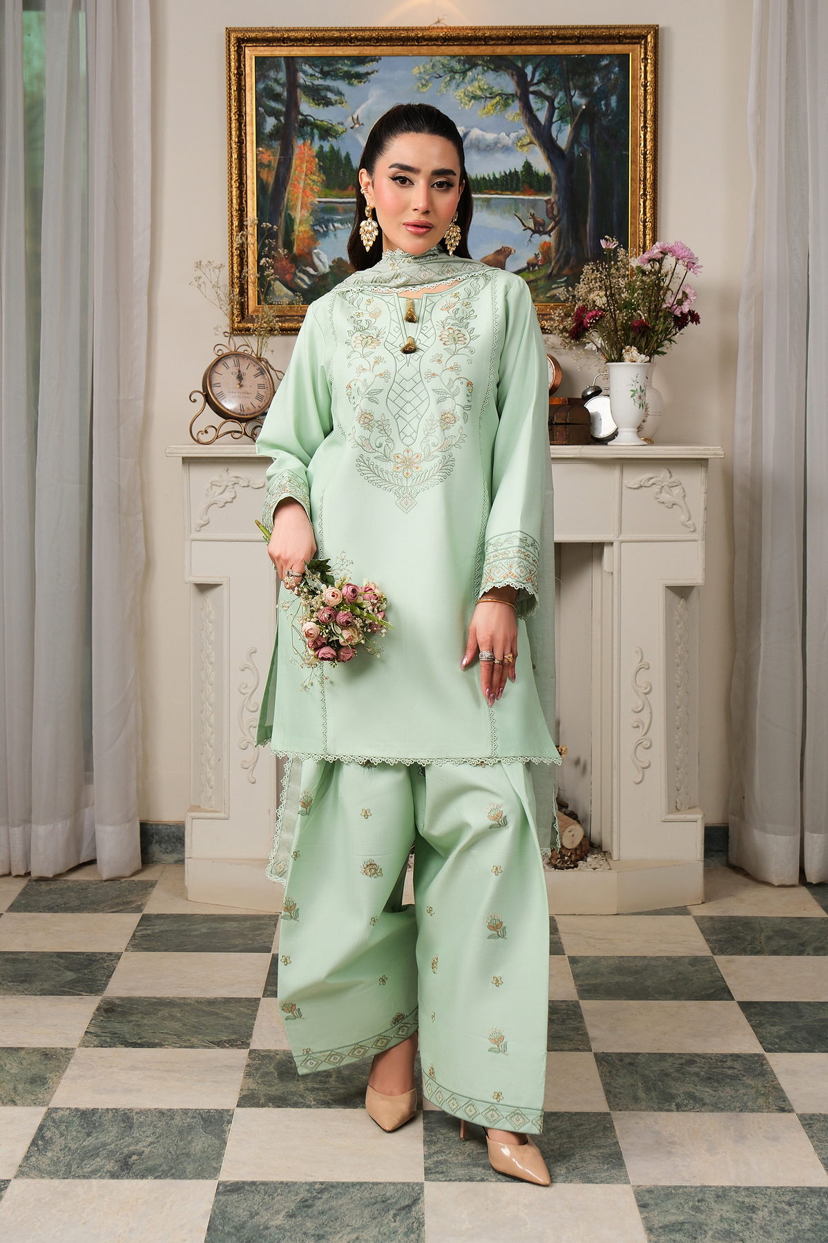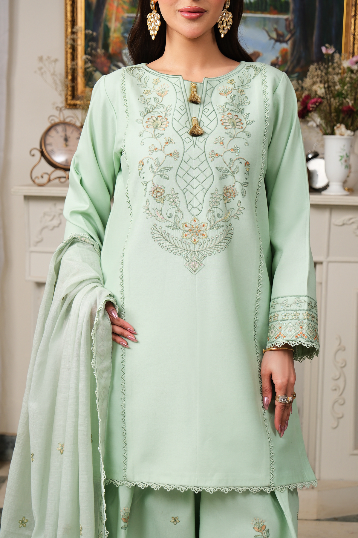 Introducing a Pistachio 3-piece ready-to-wear ensemble, designed with refined elegance and delicate craftsmanship. The straight-cut shirt features intricate embroidery along the neckline and front, while the sleeves and hem are beautifully detailed to create a balanced and sophisticated look.