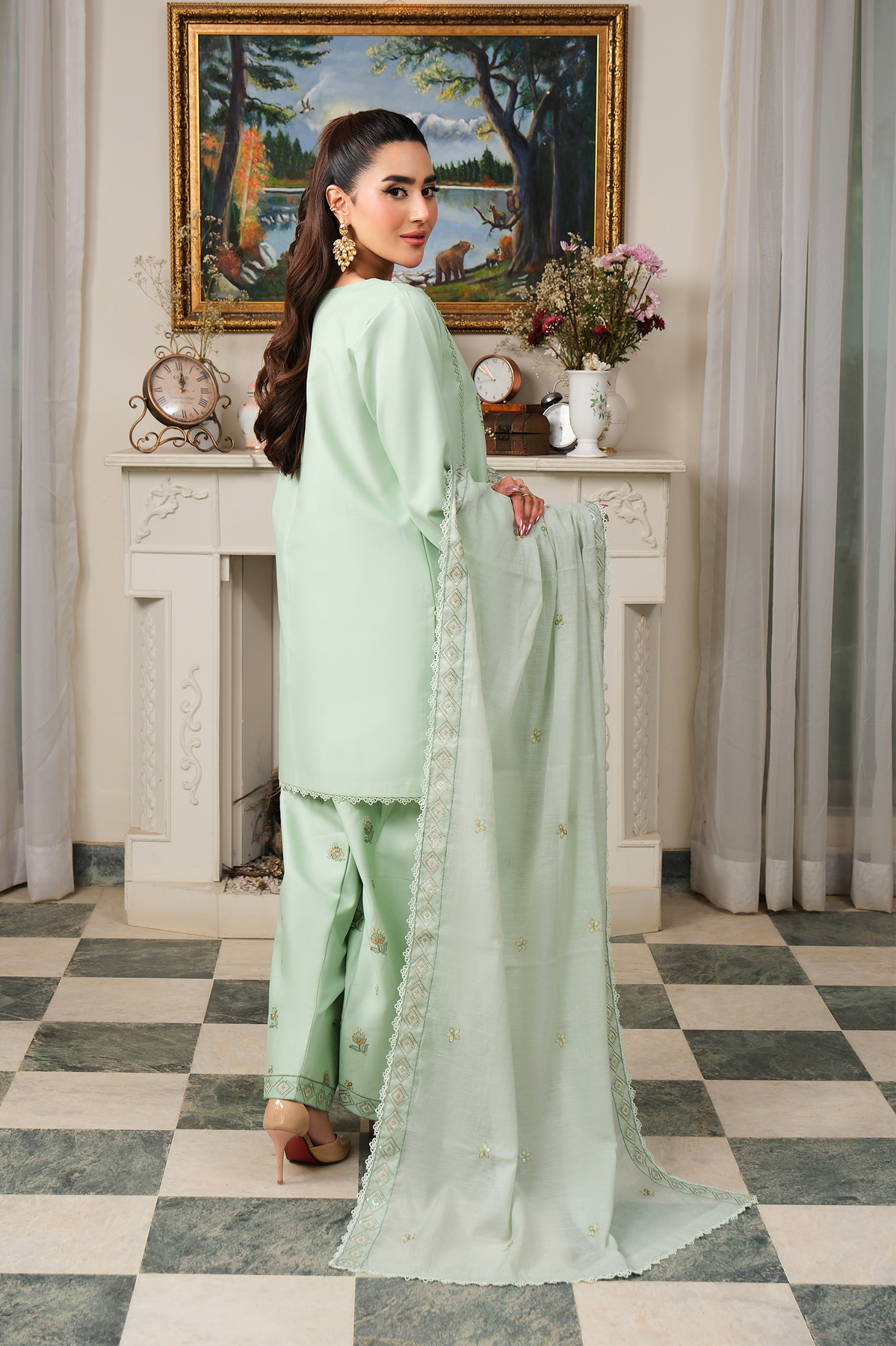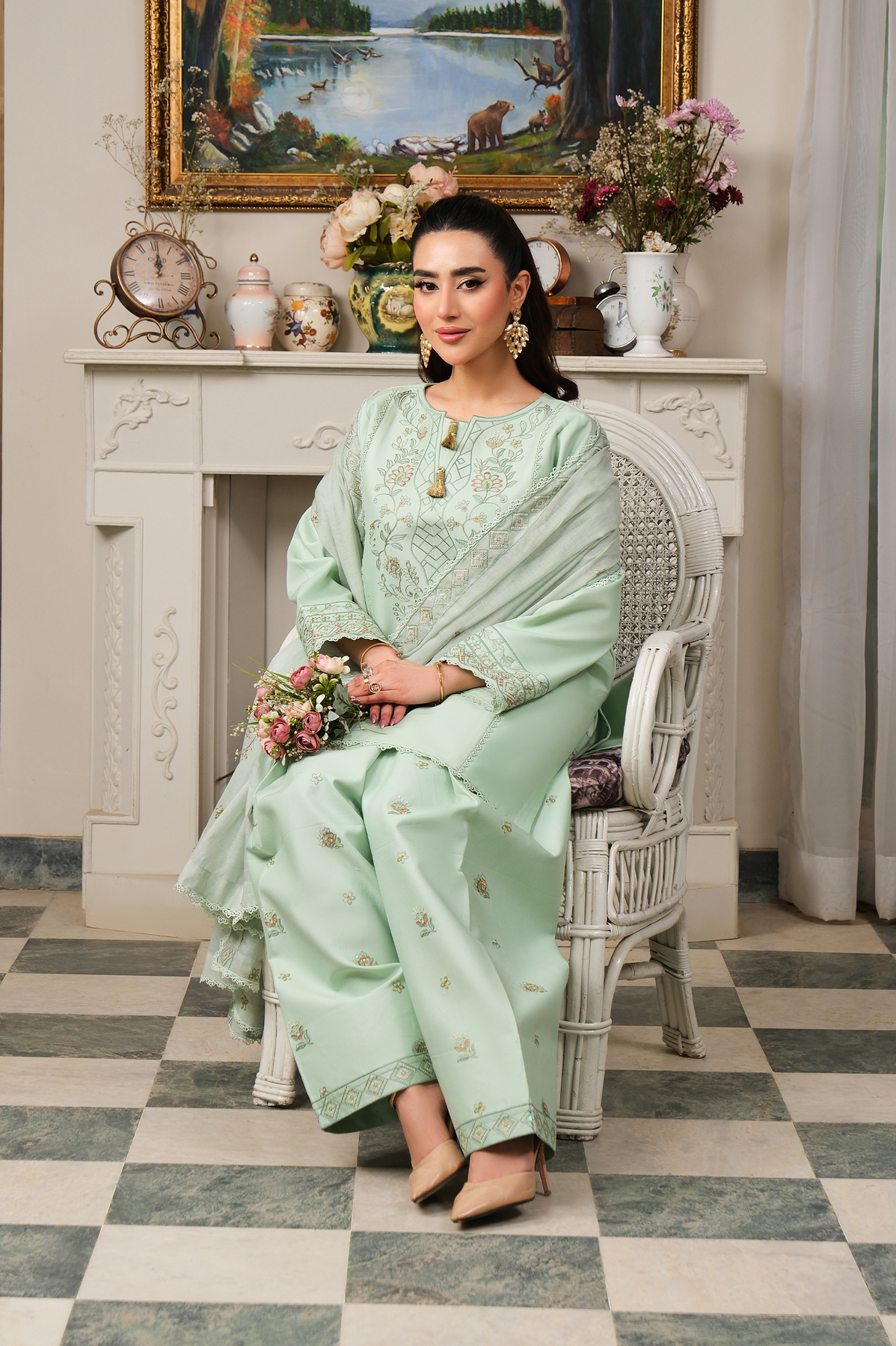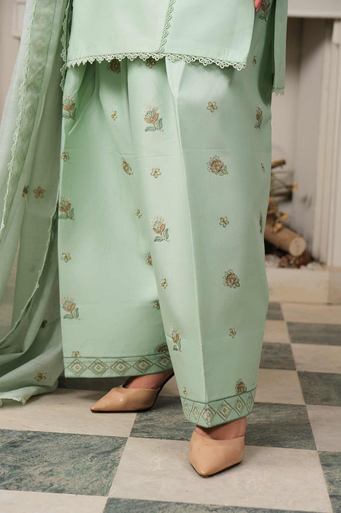 Introducing a Pistachio 3-piece ready-to-wear ensemble, designed with refined elegance and delicate craftsmanship. The straight-cut shirt features intricate embroidery along the neckline and front, while the sleeves and hem are beautifully detailed to create a balanced and sophisticated look.