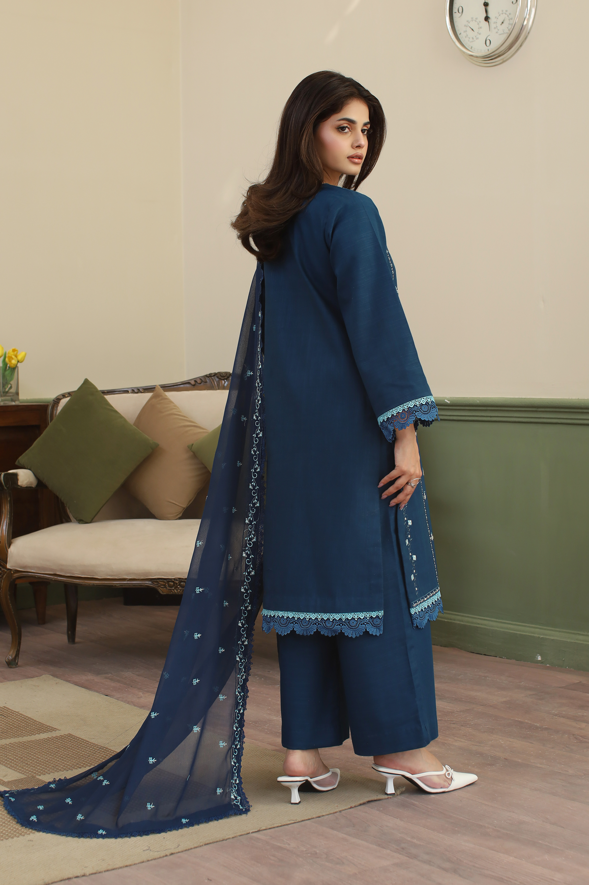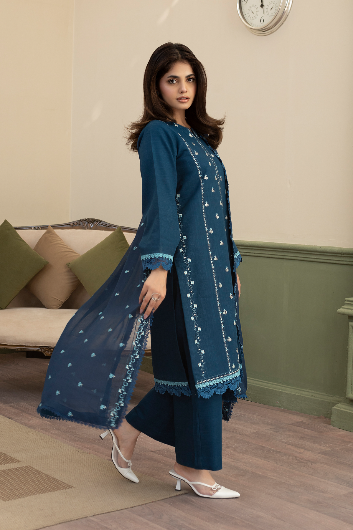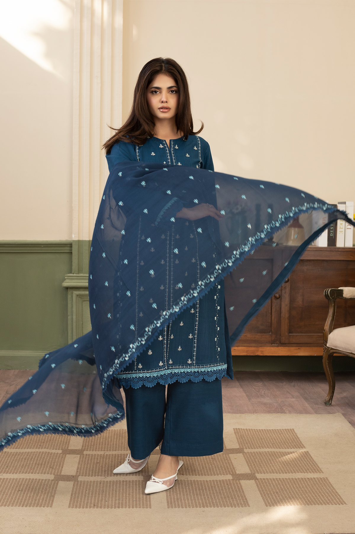 Step out in style with the Ruhab 3-Piece Ready-to-Wear suit in a striking Zinc colour. This ensemble features a modern Khaddar shirt with a trendy open-style cutline, detailed with elegant front embroidery and lining embroidery on the front. The shirt's hem and sleeves are beautifully accented with double contrast laces. Paired with matching Khaddar culottes trousers and a soft Chiffon dupatta that features an all-over spray and finished edges, the Ruhab set offers a contemporary yet cozy look perfect for any occasion.
