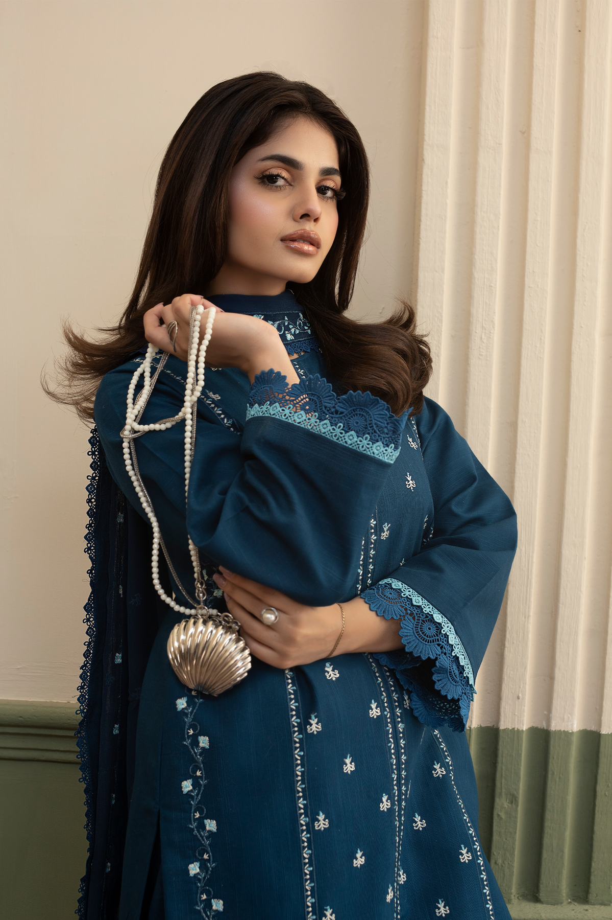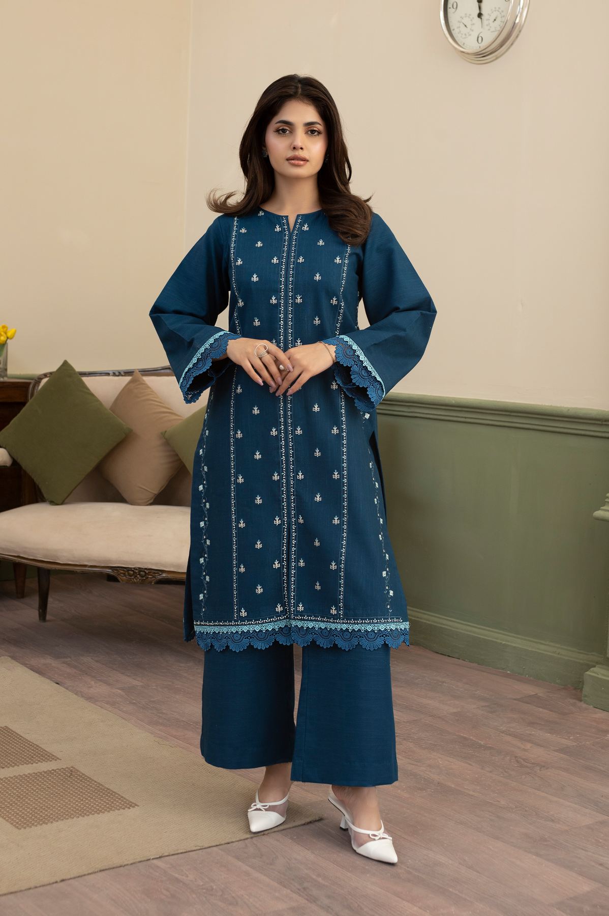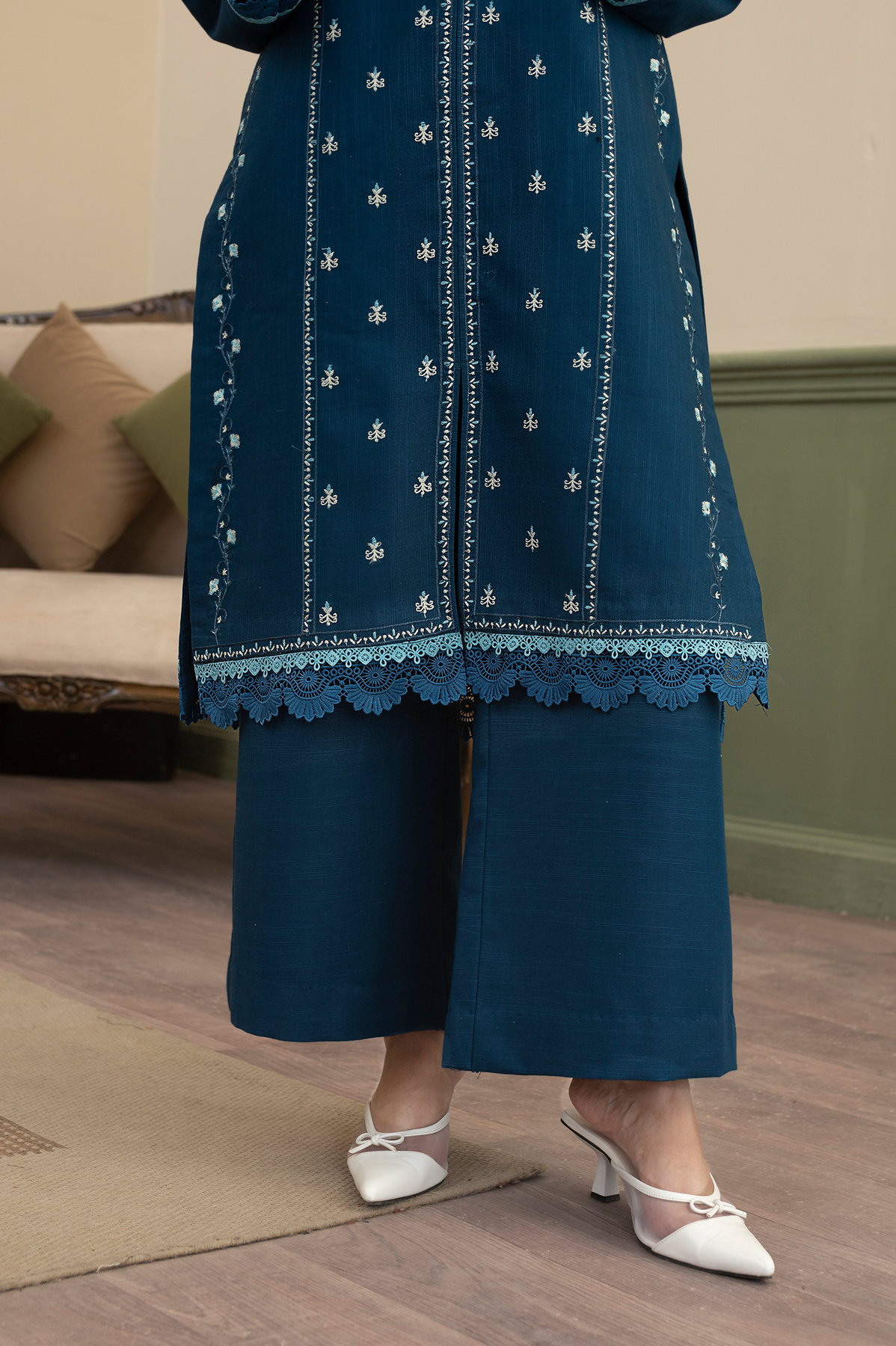 Step out in style with the Ruhab 3-Piece Ready-to-Wear suit in a striking Zinc colour. This ensemble features a modern Khaddar shirt with a trendy open-style cutline, detailed with elegant front embroidery and lining embroidery on the front. The shirt's hem and sleeves are beautifully accented with double contrast laces. Paired with matching Khaddar culottes trousers and a soft Chiffon dupatta that features an all-over spray and finished edges, the Ruhab set offers a contemporary yet cozy look perfect for any occasion.